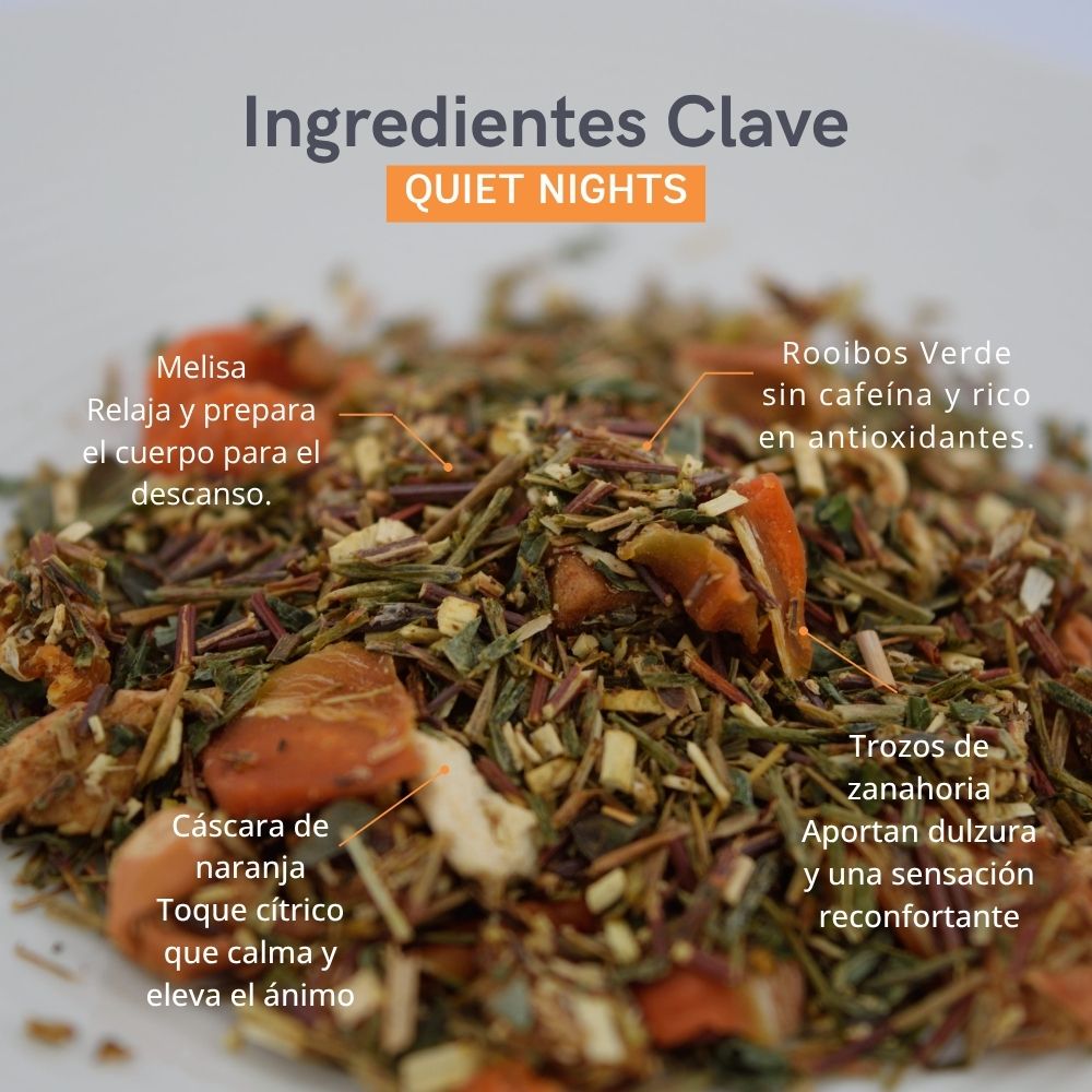 Mezcla perfecta para relajar cuerpo y mente, facilitando un sueño profundo y reparador. Con rooibos verde, trozos de manzana, zanahoria y naranja, cáscara de cítricos, melisa y esencias naturales.