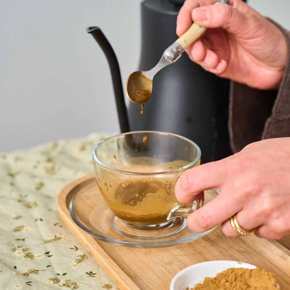 En una taza pon 1 cucharadita (≈2.5 g) de chai en polvo y un chorrito de agua caliente (≈ 20 ml, ideal a 90°C).